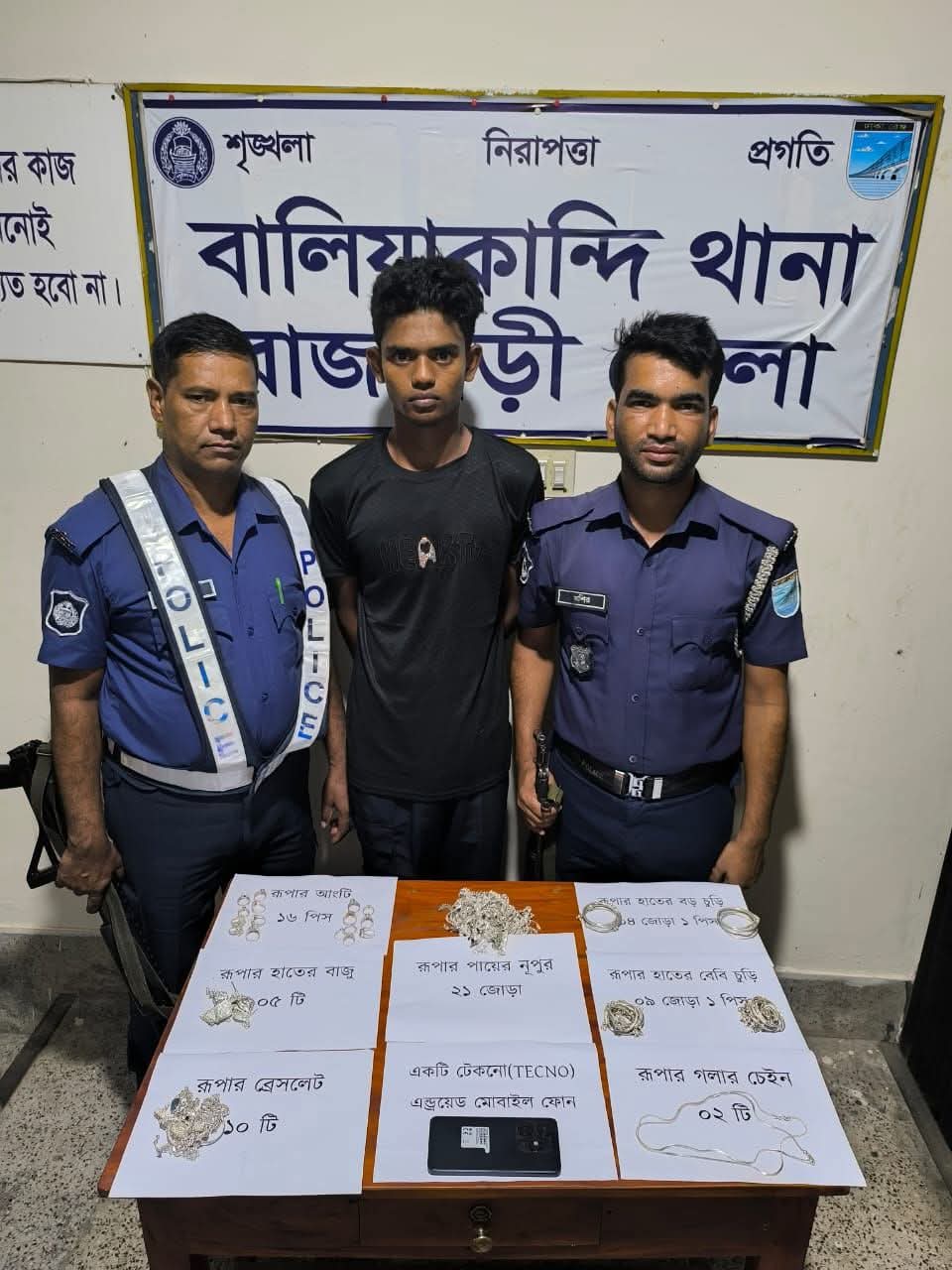 পুলিশ জানায়, সম্প্রতি বালিয়াকান্দি উপজেলার একটি স্বর্ণের দোকানে চুরি ঘটে। ঘটনাস্থল থেকে বিপুল পরিমাণ রূপা ও মোবাইল ফোন চুরি হয়। ঘটনার পর থেকেই পুলিশ অভিযানে নামে।